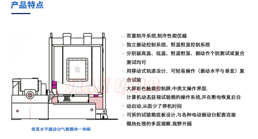 產品型號:JQTHV-500 品牌:劍 喬 用途:垂直+水平振動高低溫三綜合箱(JQTHV-500):主要是試驗箱和振動試驗系統的綜合,試驗時將溫度、濕度、振動(高溫或低溫),(正弦振動或隨機振動)以及電應力按規定的周期綜合在同