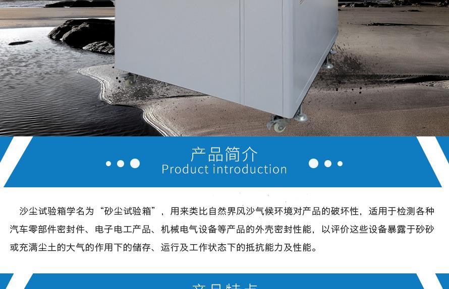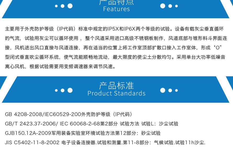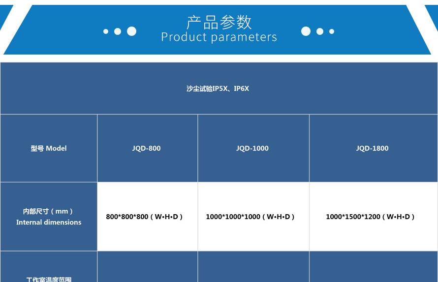 產品型號:JQD-800 品牌:劍 喬 用途:沙塵試驗箱學名為“砂塵試驗箱”,用來類比自然界風沙氣候環境對產品的破壞性,適用于檢測各種汽車零部件密封件、電子電工產品、機械電氣設備等產品的外殼密封性能