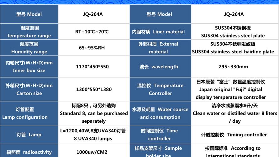 產(chǎn)品型號(hào):JQ-264A 品牌:劍 喬 用途:紫外耐氣候試驗(yàn)箱主要用于塑料,涂料、橡膠材料在模擬由太陽(yáng)光,雨水、露水環(huán)境下的人工加速試驗(yàn)